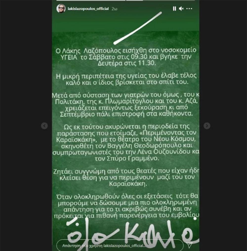 Το βράδυ της Τρίτης, ο Λάκης Λαζόπουλος επέστρεψε στα μέσα κοινωνικής δικτύωσης και θέλησε να ευχαριστήσει όλους όσους του ευχήθηκαν για γρήγορα περαστικά.