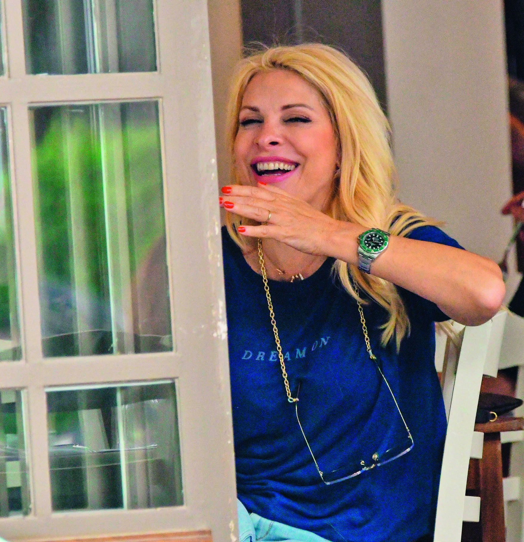Πίνοντας λευκό κρασί με την παρέα της και τρώγοντας ψαρομεζέδες, η «βασίλισσα» της τηλεόρασης έδειχνε πολύ άνετη μαζί τους και το απολάμβανε με την ψυχή της.