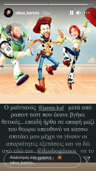 «Ο μαϊντανός James Καφετζής, μετά από rapid test που έκανε βγήκε θετικός. Επειδή ήρθα σε επαφή μαζί του, θεωρώ υπεύθυνο να κάτσω σπιτάκι μου μέχρι να γίνουν οι απαραίτητες εξετάσεις και να δω από εδώ τον Ηλία Μπόγδανο να το σηκώνει», έγραψε ο Νίκος Μπάρτζης.