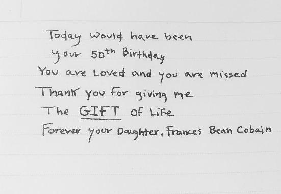 «Σήμερα, θα γινόσουν 50 ετών. Έχεις αγαπηθεί και λείπεις. Σε ευχαριστώ που μου έδωσες το δώρο της ζωής. Για πάντα, η κόρη σου, Φράνσις Μπιν Κομπέιν», έγραψε στο χειρόγραφο μήνυμά της, σύμφωνα με το msn.com.