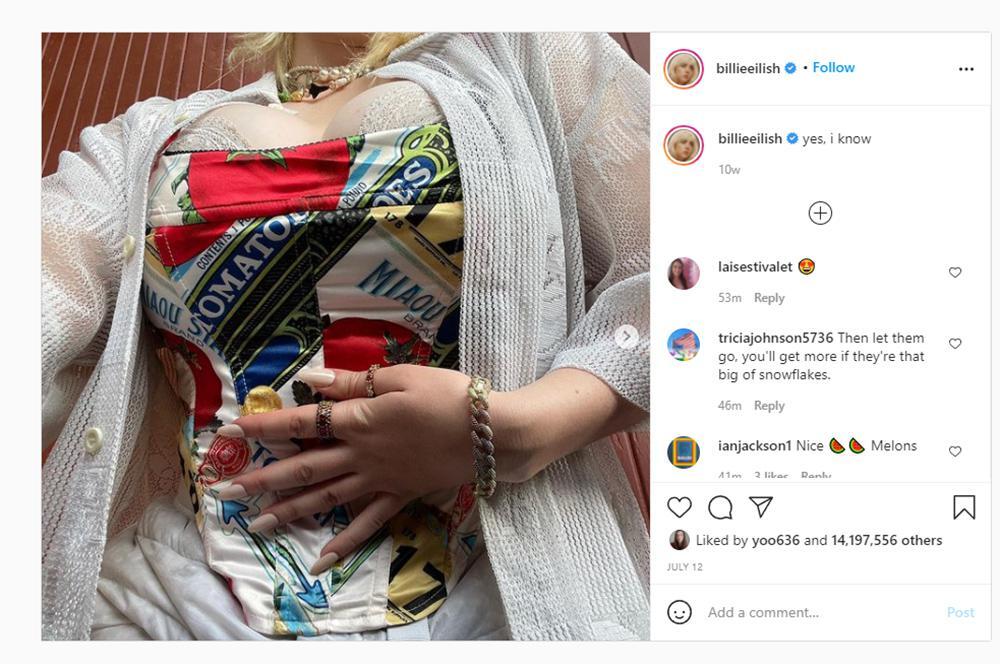 «Οι άνθρωποι έχουν μια προσκόλληση. Αλλά είναι πολύ ανθρώπινο. Έχασα 100.000 followers μόνο λόγω του στήθους. Οι άνθρωποι φοβούνται τα μεγάλα στήθη», είπε γελώντας και αναφερόμενη σε μία φωτογραφία της με στενό κορσέ που είχε ανεβάσει στο Instagram.