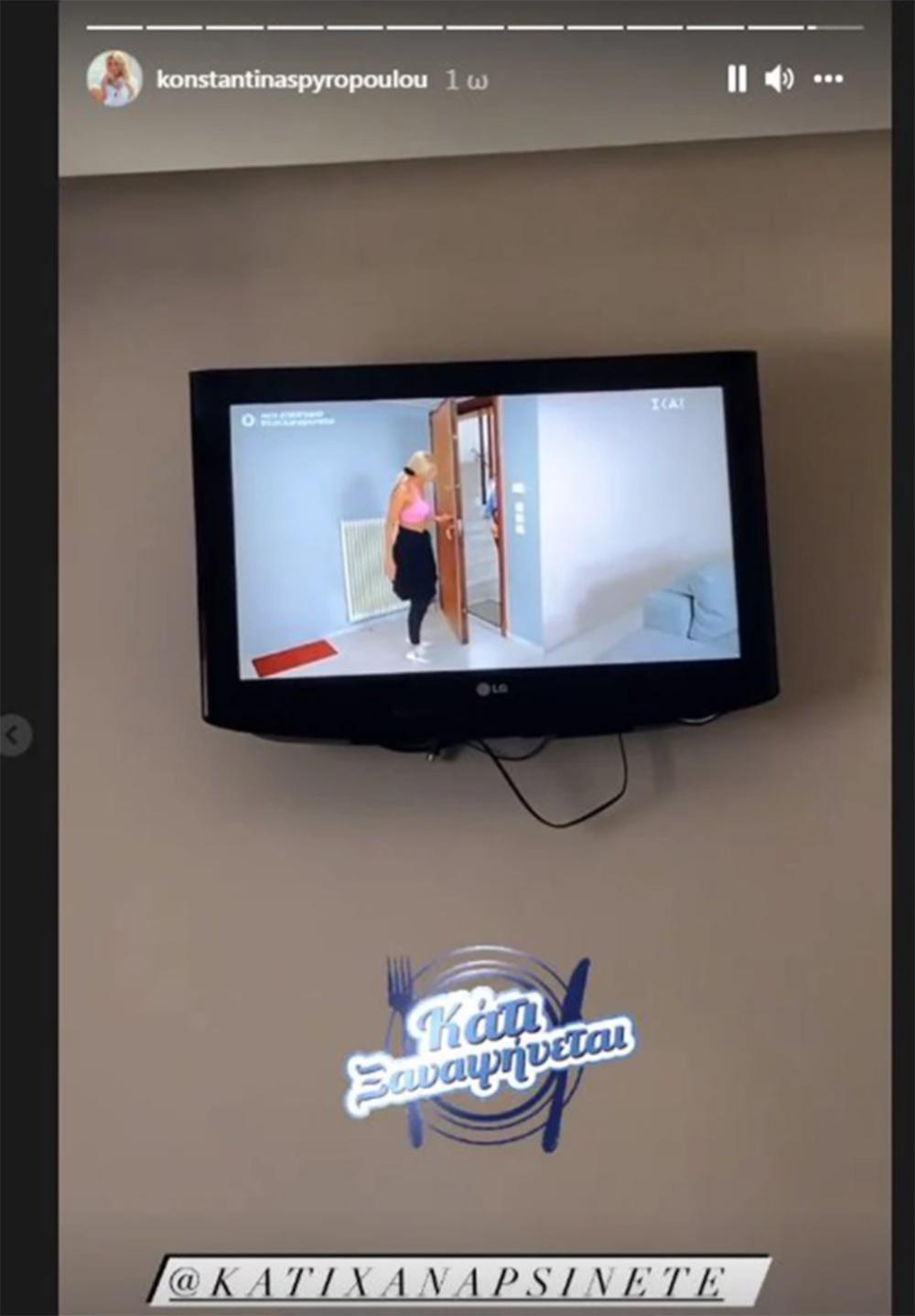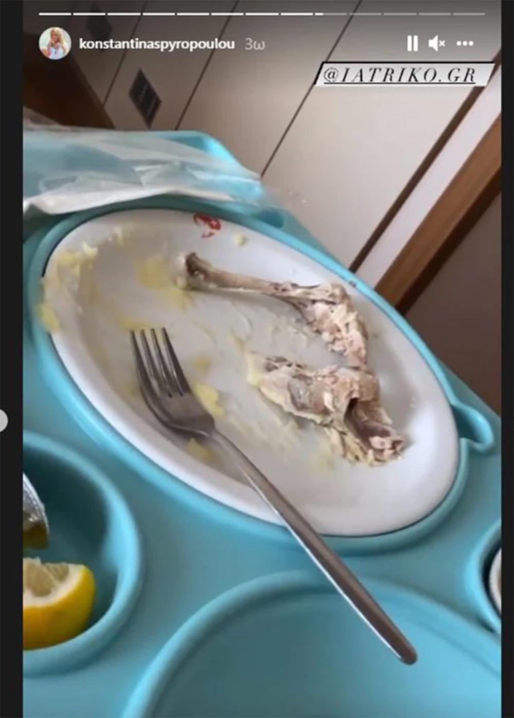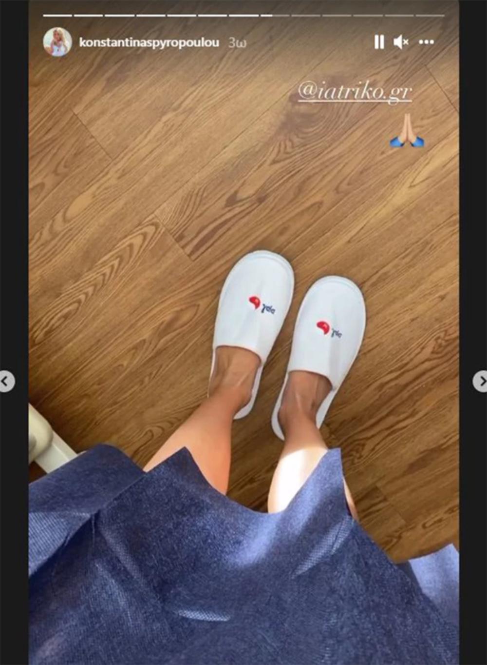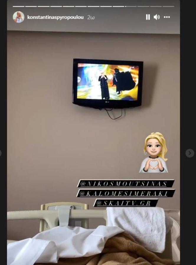Στην πρώτη φωτογραφία η Κωνσταντίνα Σπυροπούλου δείχνει τα πόδια της, όπου και διακρίνεται να φοράει τη μπλούζα του νοσοκομείου. Στην επόμενη η παρουσιάστρια διευκρινίζει πως η όρεξη της, αν και νοσηλεύεται, δεν έχει μειωθεί ενώ στα επόμενα stories παρακολουθεί τηλεόραση.