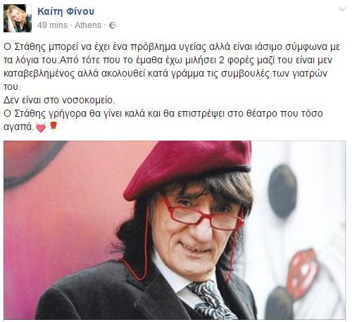 Η Καίτη Φίνου, που υπήρξε ζευγάρι με τον ηθοποιό για πάνω από πέντε χρόνια, αποκάλυψε μέσω του Facebook πως έχει μιλήσει μαζί του δύο φορές και όντως αντιμετωπίζει πρόβλημα με την υγεία του, «αλλά είναι ιάσιμο σύμφωνα με τα λόγια του».