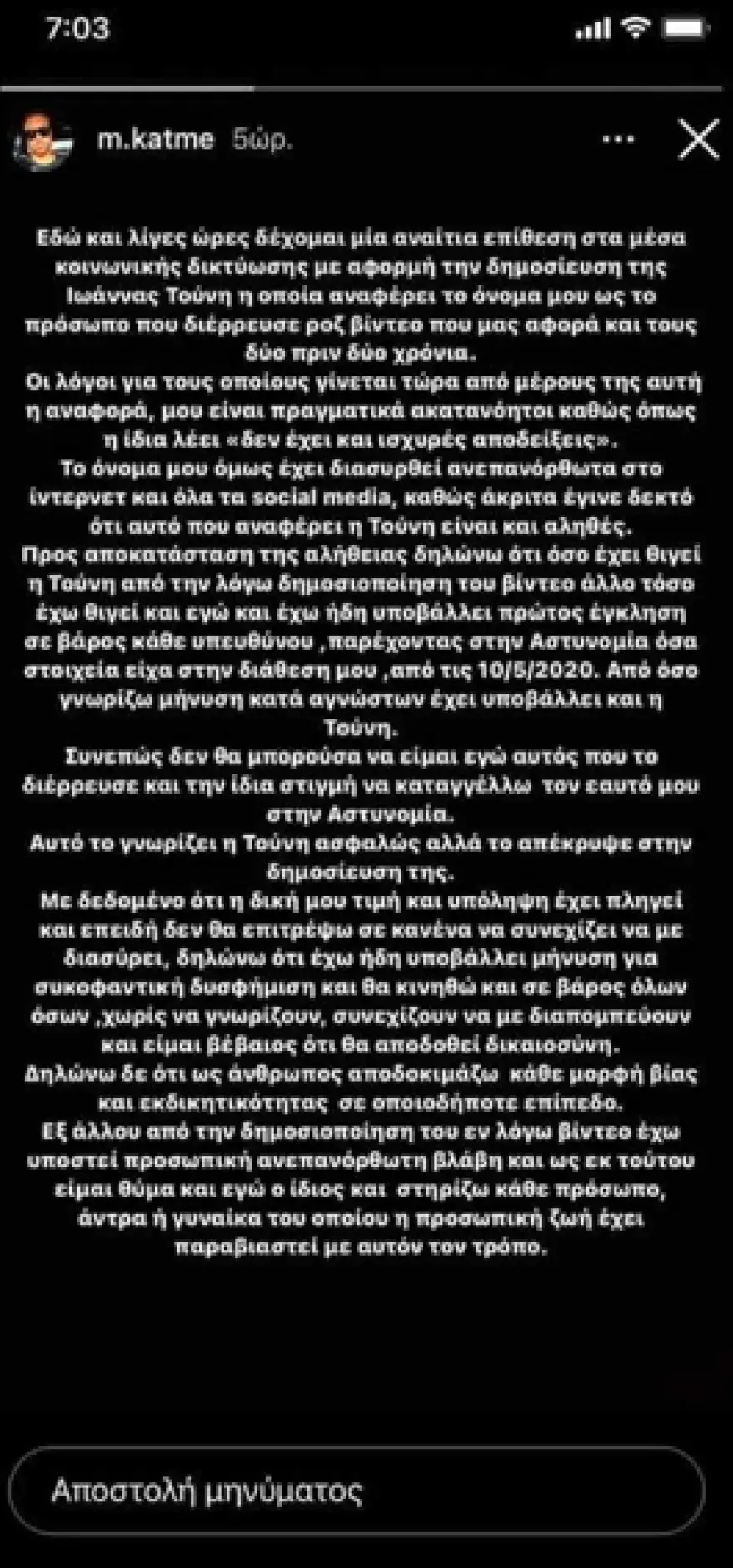 «Ειδικότερα το Σάββατο και περί ωρα 19:40, ανέβασε στον προσωπικό της λογαριασμό στο ίνσταγκραμ με το όνομα J Touni βίντεο με την ίδια να αναφέρει ότι εγώ, καθώς με κατονομάζει, διέρρευσα revenge πορνό βίντεο με εμένα και την ίδια σε ιστοσελίδες ερωτικού περιεχομένου. Αυτό είναι ψευδές καθώς για το εν λόγω βίντεο είχα υποβάλλει στις 10 Μαΐου 2020 μήνυση, κατά παντός υπευθύνου στην δίωξη ηλεκτρονικού εγκλήματος Θεσσαλονίκης. Απ’ όσο γνωρίζω για το εν λόγω περιστατικό και η Τούνη Ιωάννα είχε κάνει μήνυση κατά αγνώστων καθώς το αναφέρει σε μέσα κοινωνικής δικτύωσης. Άλλωστε και στη σημερινή της τρισέλιδη δημοσίευση, την οποία εγχειρίζω, αναφέρει ότι δεν έχει ισχυρές αποδείξεις και ότι μπορώ να τις κάνω αγωγή για συκοφαντική δυσφήμιση. Αυτή η δημοσίευση είναι ψευδής το σύνολο της και προσβάλλει την τιμή και την υπόληψη μου ανεπανόρθωτα, καθώς το προφίλ της είναι δημόσιο, έχει αναδημοσιευτεί σε όλες τις σελίδες όπως και στο Πρώτο Θέμα και το in gr με φωτογραφίες μου, Και έχω κατακλυστεί από επικριτικά μηνύματα στα μέσα κοινωνικής δικτύωσης που διατηρώ. Ζητώ την κατά το νόμο τιμωρία της».