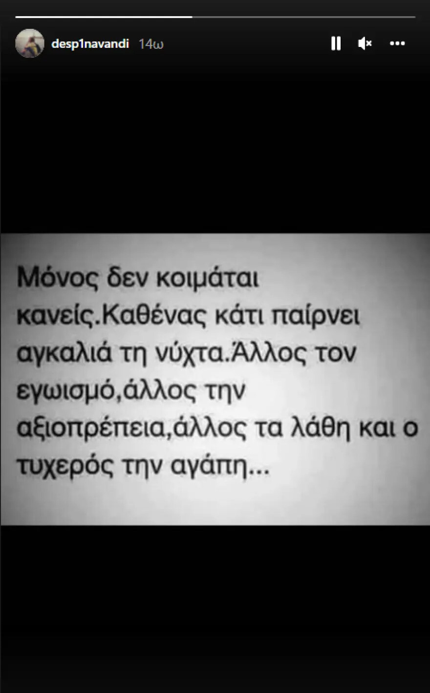 Η τραγουδίστρια έκανε και ένα Insta Story, πριν από κάποιες ώρες, στέλνοντας το δικό της μήνυμα αγάπης. «Μόνος δεν κοιμάται κανείς. Καθένας κάτι παίρνει αγκαλιά τη νύχτα. Άλλος τον εγωισμό, άλλος την αξιοπρέπεια, άλλος τα λάθη και ο τυχερός την αγάπη», έγραψε η Δέσποινα Βανδή.