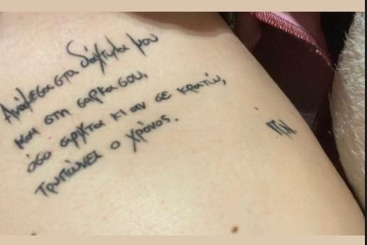 «Ανάμεσα στα δάχτυλά μου και στη σάρκα σου, όσο σφιχτά κι αν σε κρατώ, τρυπώνει ο χρόνος. Π.Ν», γράφει το τατουάζ της Διονυσίας Γεωργιάδου.