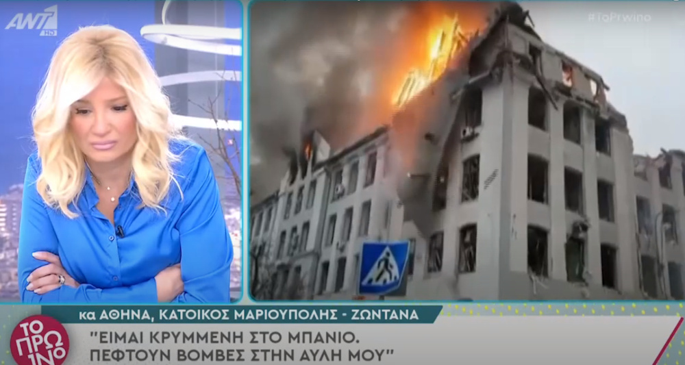 “Τώρα στην αυλή μου πέφτουν βόμβες. Μιλάμε για το τώρα. Οι Ρώσοι μας βομβαρδίζουν, σκοτώνουν τον πληθυσμό της Ουκρανίας. Οι βόμβες δεν ξεχωρίζουν αν είσαι Έλληνας, Ουκρανός ή Ρώσος” φώναζε η ίδια κλαίγοντας.
