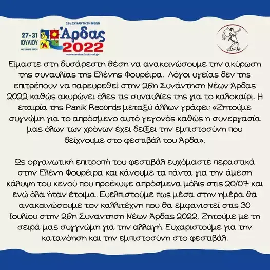 Την είδηση γνωστοποίησαν οι διοργανωτές της 26ης Συνάντησης Νέων Άρδα 2022, στις Καστανιές Έβρου, όπου επρόκειτο να εμφανιστεί η γνωστή τραγουδίστρια. Όπως ενημερώνουν, η Ελένη Φουρέιρα “δεν δεν θα παρεβρεθεί στην σκηνή του φεστιβάλ Άρδα, ενώ παράλληλα ακυρώνονται όλες οι προγραμματισμένες εμφανίσεις της στην Ελλάδα, για λόγους υγείας”.