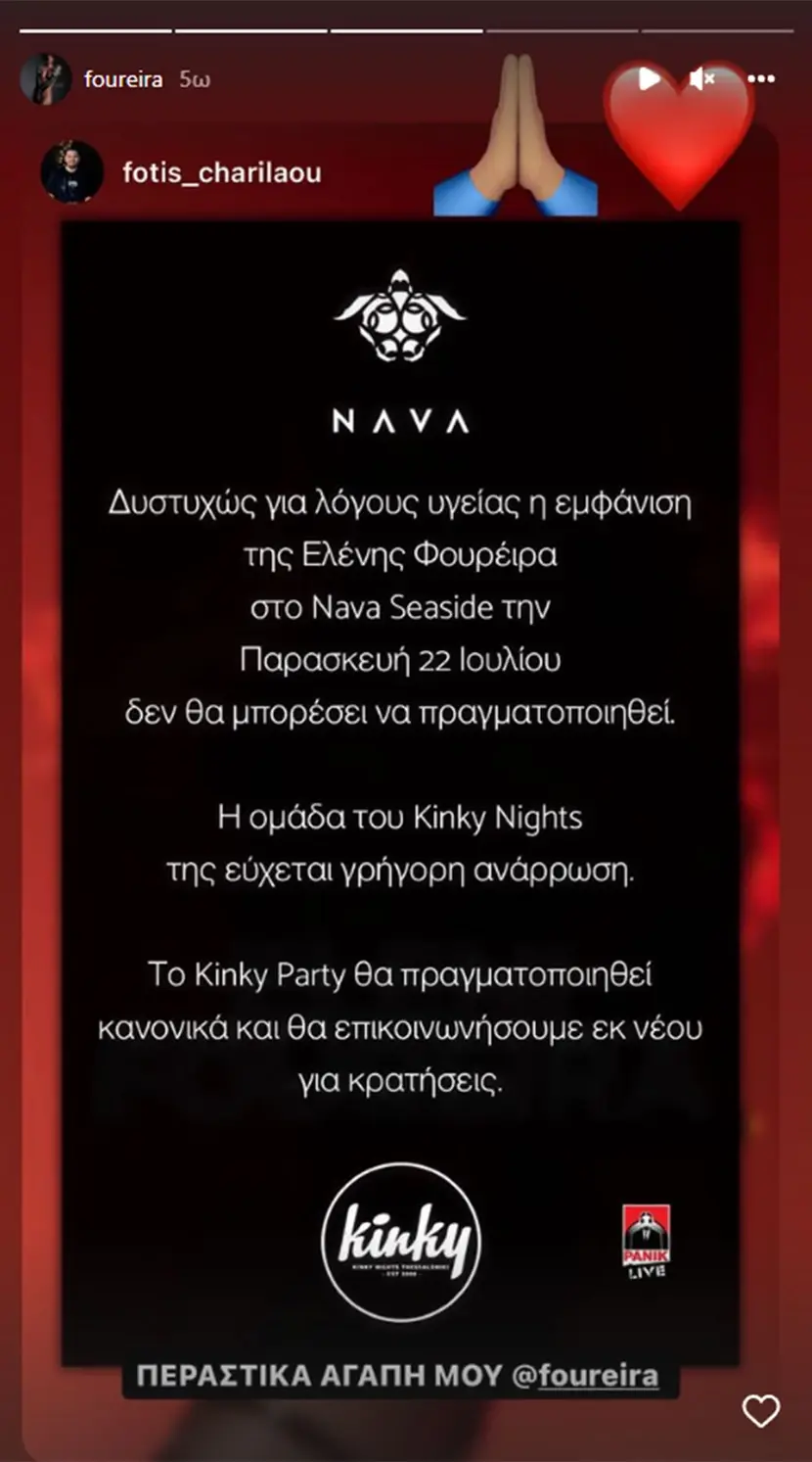 «Δυστυχώς για λόγους υγείας η εμφάνιση της Ελένης Φουρέιρα στο Nava Seaside την Παρασκευή 22 Ιουλίου δεν θα μπορέσει να πραγματοποιηθεί. Η ομάδα του Kinky Nights της εύχεται γρήγορη ανάρρωση. Το Kinky Party θα πραγματοποιηθεί κανονικά και θα επικοινωνήσουμε εκ νέου για κρατήσεις», ανέφερε η ανακοίνωση.
