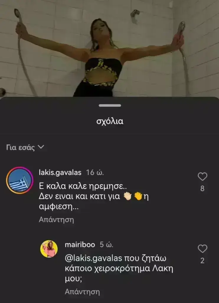 «Ε καλά καλέ ηρέμησε.. Δεν είναι και κάτι για χειροκρότημα η αμφίεση…» έγραψε ο Λάκης Γαβαλάς στη Μαίρη Συνατσάκη, με την influencer να αντιδρά: «που ζητάω κάποιο χειροκρότημα Λάκη μου;».