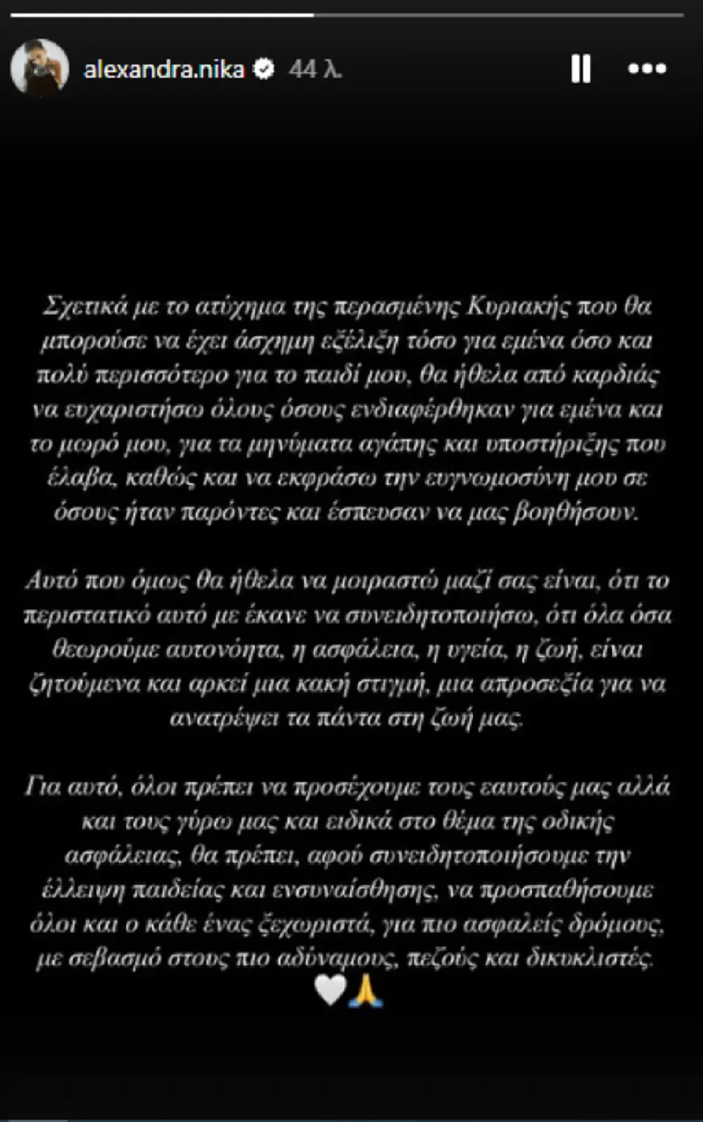 «Σχετικά με το ατύχημα της περασμένης Κυριακής που θα μπορούσε να έχει άσχημη εξέλιξη τόσο για εμένα όσο και πολύ περισσότερο για το παιδί μου, θα ήθελα από καρδιάς να ευχαριστήσω όλους όσους ενδιαφέρθηκαν για εμένα και το μωρό μου, για τα μηνύματα αγάπης και υποστήριξης που έλαβα, καθώς και να εκφράσω την ευγνωμοσύνη μου σε όσους ήταν παρόντες και έσπευσαν να μας βοηθήσουν.