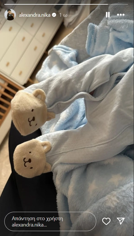 Αυτή τη φορά, βλέπουμε τον μικρό να φορά μία γαλάζια φόρμα καθώς εκείνη τον κρατά στην αγκαλιά της και φαίνεται η λευκή συρταριέρα και η υπέροχη κούνια στις αποχρώσεις του λευκού και του καφέ.