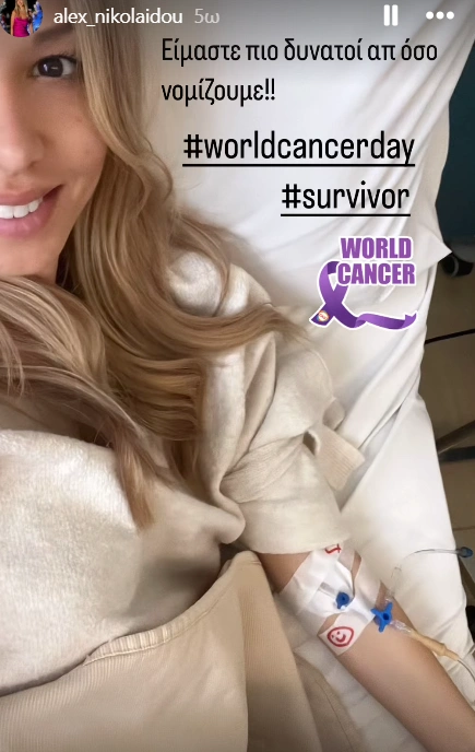 Με αφορμή την Παγκόσμια Ημέρα κατά του Καρκίνου, εξομολογήθηκε την άγνωστη μάχη της με την ασθένεια. Μοιράστηκε μία φωτογραφία της από το νοσοκομείο, γράφοντας: «Είμαστε πιο δυνατοί από όσο νομίζουμε». Η κολλητή της φίλη, Κατερίνα Καινούργιου, έκανε repost την ανάρτησή της, γράφοντας: «Είσαι η ηρωίδα μου. Τόσο περήφανη για σένα Άλεξ μου. Το πιο δυνατό πλάσμα που έχω δίπλα μου. Σε αγαπώ»…