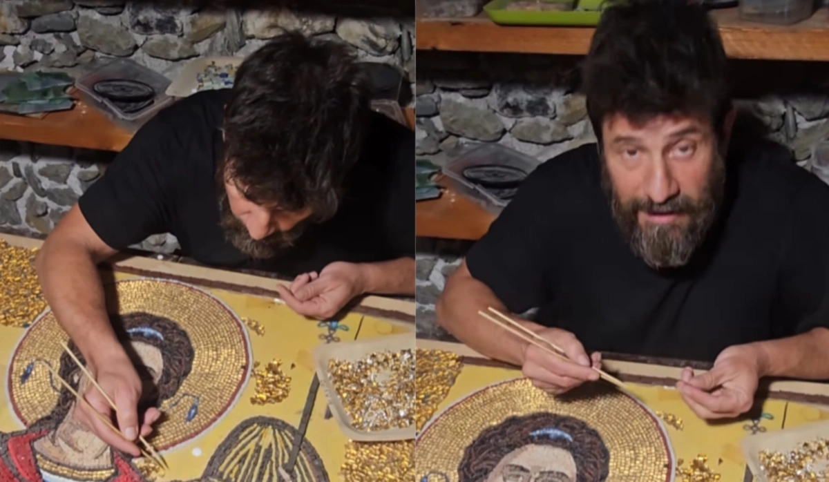 Σε ένα από τα τελευταία βίντεο που έχει δημοσιεύσει ο Αλέξης Γεωργούλης στον λογαριασμό του στο instagram, τον βλέπουμε να φτιάχνει μια ψηφιδωτή αγιογραφία του Αρχάγγελο Μιχαήλ. Και επειδή δεν είχε στη διάθεσή του ειδικές λαβές, χρησιμοποίησε καλαμάκια από σουβλάκια.