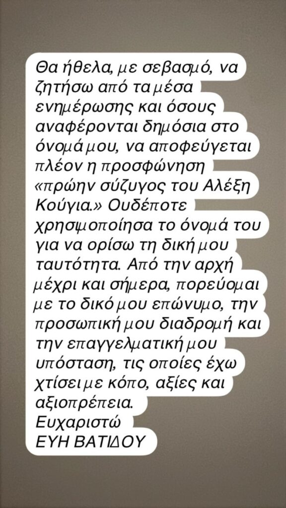 «Θα ήθελα, με σεβασμό, να ζητήσω από τα μέσα ενημέρωσης και όσους αναφέρονται δημόσια στο όνομά μου, να αποφεύγεται πλέον η προσφώνηση “πρώην σύζυγος του Αλέξη Κούγια”. Ουδέποτε χρησιμοποίησα το όνομά του για να ορίσω τη δική μου ταυτότητα, Από την αρχή μέχρι και σήμερα πορεύομαι με το δικό μου επώνυμο, την προσωπική μου διαδρομή και την επαγγελματική μου υπόσταση, τις οποίες έχω χτίσει με κόπο, αξίες και αξιοπρέπεια. Ευχαριστώ», έγραψε χαρακτηριστικά η Εύη Βατίδου.