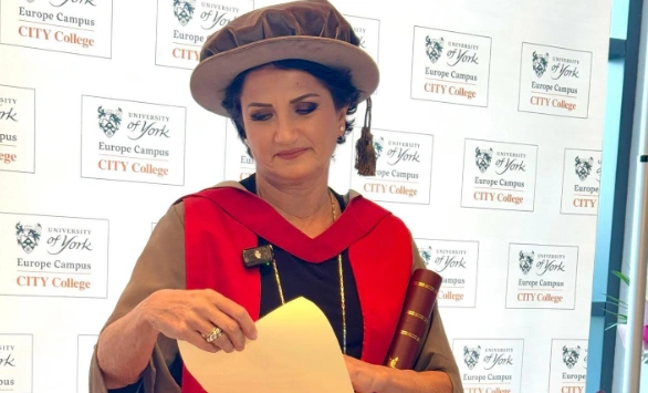 Στη λεζάντα αναλυτικά έγραψε: «Μεγάλη τιμή και συγκίνηση να μου απονεμηθεί από τον Πρύτανη του Πανεπιστημίου του York ,Charlie Jeffery, (Vice -Chancellor and President University of York) ο τίτλος του Επίτιμου Διδάκτορα ως τιμητική διάκριση από το Πανεπιστήμιο YORK της Μεγάλης Βρετανίας στο Μέγαρο Μουσικής Θεσσαλονίκης. Σας ευχαριστώ μέσα από τη καρδιά μου… Το αφιερώνω στους γονείς μου… Και Dr. Η μοναδική – σπουδαία ηθοποιός Ελληνίδα Μελίνα Κανακαρίδης ήταν μια αποκάλυψη!!! Σεμνή /χαμογελαστή! Λαμπερή/Ζεστός άνθρωπος!!! Με απίθανη αύρα μας κέρδισε αμέσως!!!Μπράβο!!! για την οργάνωση και το τελετουργικό! Άψογη! Μοναδική βραδιά, γεμάτη ελπίδα γεμάτη με απόφοιτους από όλα τα κράτη της γης… το μέλλον ξεκινάει. Όπου κι αν πάτε να έχετε στη καρδιά σας την Ελλάδα».