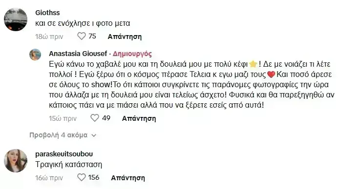 Όπως ήταν αναμενόμενο, κάτω από το βίντεο υπήρξαν πολλά αρνητικά σχόλια, με τους περισσότερους να μην καταλαβαίνουν τον λόγο που βρέθηκε στο πανηγύρι η Αναστασία Γιούσεφ, αφού προτιμά… άλλο ρεπερτόριο για τον χορό της.
