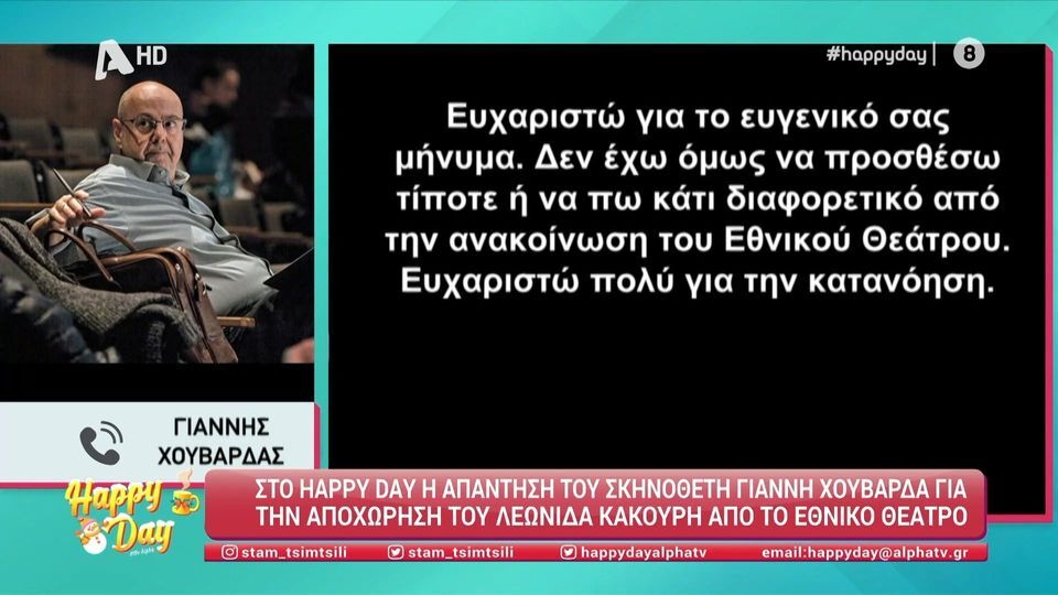«Ευχαριστώ πολύ για το ευγενικό σας μήνυμα. Δεν έχω όμως να προσθέσω τίποτε ή να πω κάτι διαφορετικό από την ανακοίνωση του Εθνικού Θεάτρου. Ευχαριστώ πολύ για την κατανόηση» ήταν τα λόγια του Γιάννη Χουβαρδά.