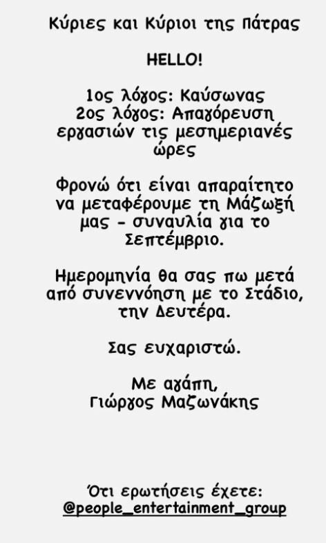 Ημερομηνία θα σας πω μετά από συνεννόηση με το Στάδιο την Δευτέρα. Σας ευχαριστώ. Με αγάπη, Γιώργος Μαζωνάκης», έγραψε χαρακτηριστικά ο Γιώργος Μαζωνάκης.