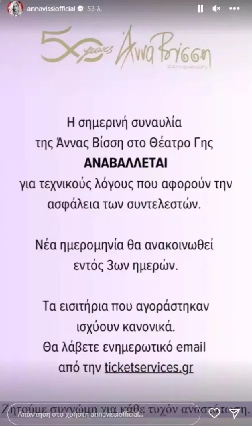 «Η σημερινή συναυλία της Άννας Βίσση στο Θέατρο Γης αναβάλλεται για τεχνικούς λόγους που αφορούν την ασφάλεια των συντελεστών. Νέα ημερομηνία θα ανακοινωθεί εντός τριών ημερών. Τα εισιτήρια που αγοράστηκαν ισχύουν κανονικά, ζητούμε συγγνώμη για τυχόν αναστάτωση», ανέφερε η ανακοίνωση.