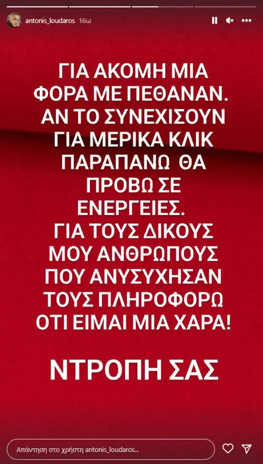 Ο ηθοποιός εξήγησε μέσα από ένα story πως κυκλοφορεί η είδηση ότι έφυγε από τη ζωή, πράγμα που προφανώς δεν υφίσταται. Όπως ανέφερε ο ίδιος στην ανάρτησή του, αν συνεχιστεί η εν λόγω κατάσταση, θα προβεί σε όλες τις νόμιμες ενέργειες.