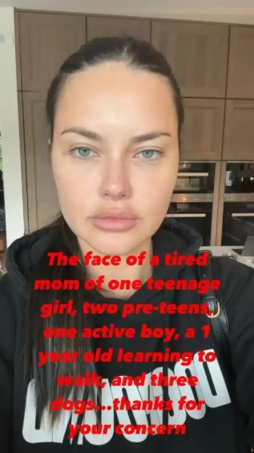 «Αυτό είναι το πρόσωπο μιας κουρασμένης μαμάς που έχει μια κόρη στην εφηβεία, μία κόρη λίγο πριν μπει στην εφηβεία, ένα αγόρι 1 έτους που μαθαίνει να περπατάει και τρία σκυλιά. Ευχαριστώ για το ενδιαφέρον σας», έγραψε στο σχόλιο που συνόδεψε τη φωτογραφία με το πρόσωπό της να μην έχει ίχνος μακιγιάζ.