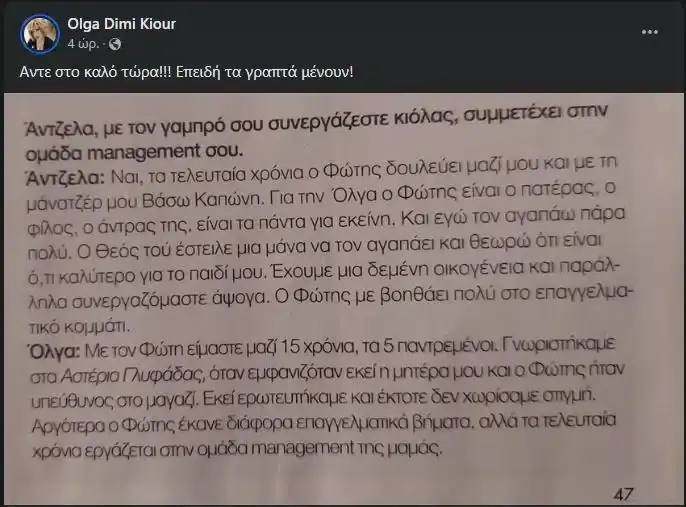 Την φωτογραφία με το απόσπασμα της συνέντευξης την συνοδεύει με την λεζάντα: «Άντε στο καλό τώρα!!! Επειδή τα γραπτά μένουν!»