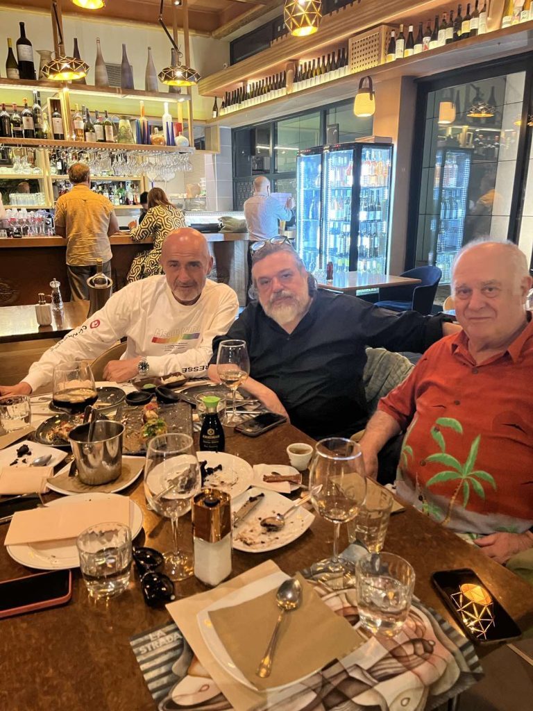 Στο πλευρό του ζευγαριού σε αυτή την όμορφη στιγμή βρέθηκαν οι στενοί συγγενείς και λιγοστοί αγαπημένοι φίλοι, όπως ο ζωγράφος Γιώργος Σταθόπουλος και ο γνωστός μάνατζερ καλλιτεχνών Στιβ Αλεξίου (απ’ όπου και οι σχετικές φωτό που δημοσιεύουμε με τον συνθέτη Δημήτρη Παπαδημητρίου, ανάμεσα στον Γιώργο Σταθόπουλο και στον Στιβ Αλεξίου). Ο συνθέτης μάλιστα μοιράστηκε με τον ζωγράφο και μνήμες τους με τον Μάνο Χατζιδάκι και η κουβέντα απογειώθηκε.