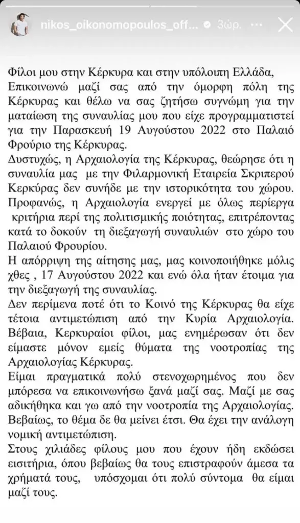 Ο Νίκος Οικονομόπουλος δημοσίευσε χθες, ένα μακροσκελές κείμενο στον προσωπικό του λογαριασμό στο Instagram, στο οποίο εξηγούσε τους λόγους που δεν θα τον δουν οι θαυμαστές του στην Κέρκυρα: