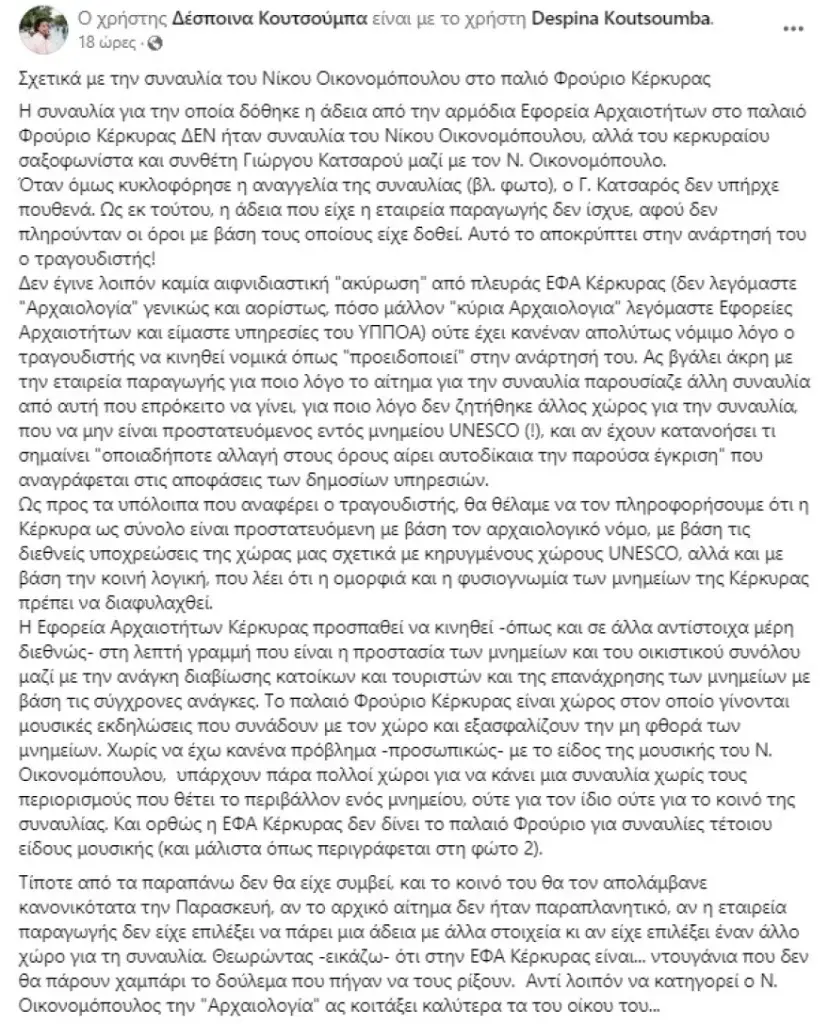 Ωστόσο, η Δέσποινα Κουτσούμπα, Πρόεδρος Ελλήνων Αρχαιολόγων, ανακοίνωσε μέσα από τον λογαριασμό της στο Facebook πως «η συναυλία για την οποία δόθηκε η άδεια από την αρμόδια Εφορεία Αρχαιοτήτων στο Παλαιό Φρούριο Κέρκυρας δεν ήταν συναυλία του Νίκου Οικονομόπουλου, αλλά του Κερκυραίου σαξοφωνίστα και συνθέτη Γιώργου Κατσαρού μαζί με τον Νίκο Οικονομόπουλο», ενώ τόνισε πως η «ΕΦΑ Κέρκυρας δεν δίνει το Παλαιό Φρούριο για συναυλίες τέτοιου είδους μουσικής».