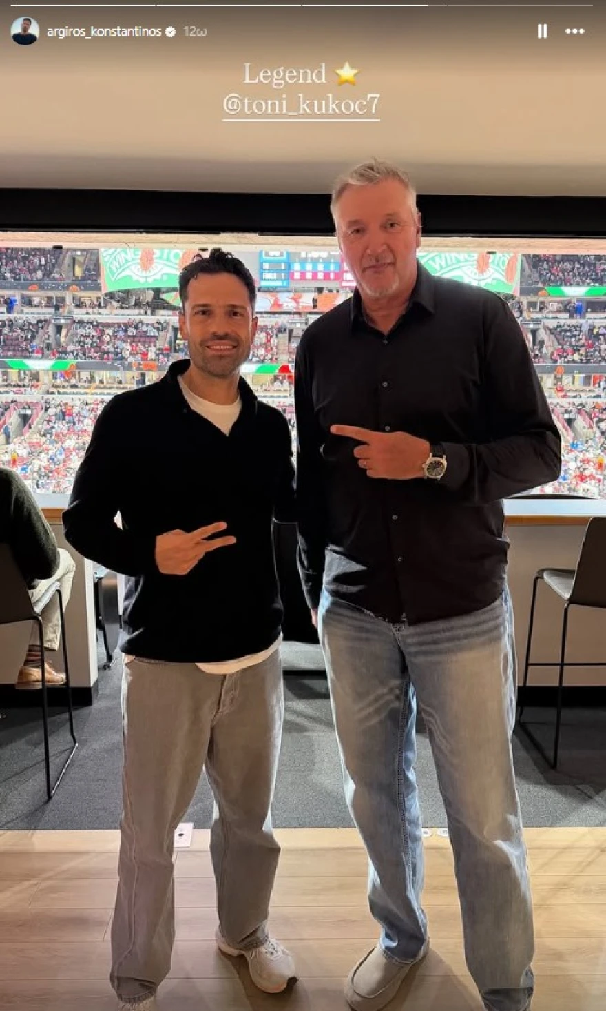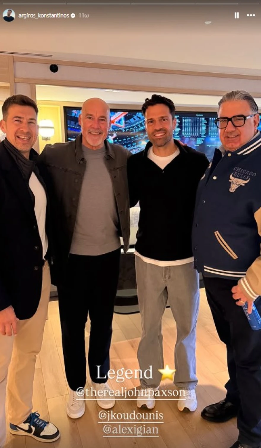 Κατά τη διάρκεια της παρουσίας του στο γήπεδο, ο Αργυρός φωτογραφήθηκε με πρόσωπα συνδεδεμένα με την ιστορία των Μπουλς, ανάμεσά τους ο Τόνι Κούκοτς και ο Τζον Πάξτον. Η συνάντηση πραγματοποιήθηκε σε χώρο κοντά στον παρκέ, σε σημείο όπου πρόσβαση έχουν προσκεκλημένοι και μέλη της ομάδας των επισήμων. Ο Τόνι Κούκοτς, Κροάτης παλαίμαχος φόργουορντ, αποτέλεσε βασικό στέλεχος της ομάδας τη δεκαετία του ’90, στην περίοδο της κορυφαίας κυριαρχίας δίπλα στον Μάικλ Τζόρνταν, και η εικόνα του με νεότερους επωνύμους επανέφερε μνήμες εκείνης της εποχής. Ο Τζον Πάξτον είναι αναγνωρίσιμο όνομα για το κοινό των Μπουλς.