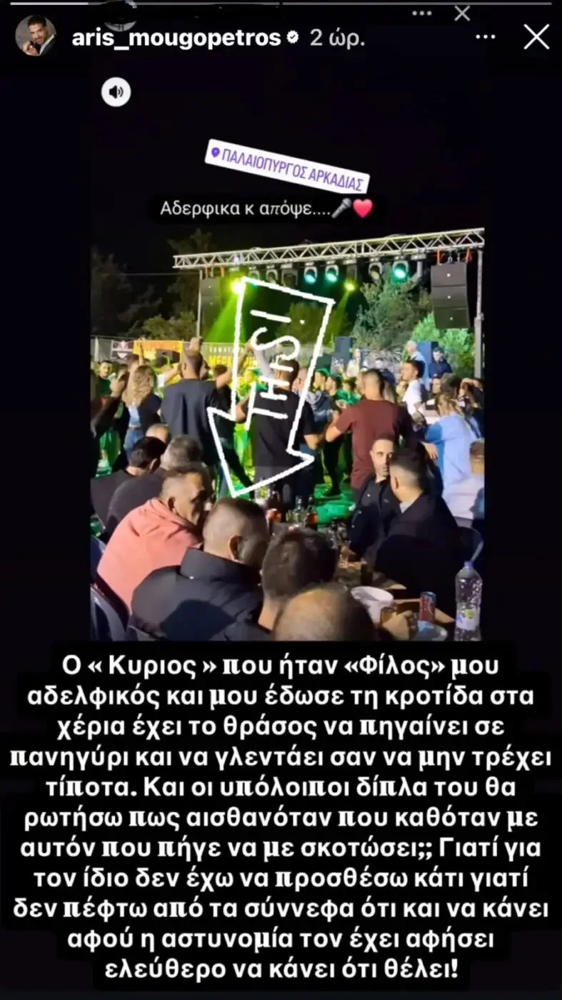 «Ο “κύριος” που ήταν “φίλος” μου αδελφικός και μου έδωσε την κροτίδα έχει το θράσος να πηγαίνει σε πανηγύρι και να γλεντάει σαν να μην τρέχει τίποτα. Και οι υπόλοιποι δίπλα του θα ρωτήσω πώς αισθάνονταν που κάθονταν με αυτόν που πήγε να με σκοτώσει. Γιατί για τον ίδιο δεν έχω να προσθέσω κάτι γιατί δεν πέφτω από τα σύννεφα ό,τι και να κάνει αφού η αστυνομία τον έχει αφήσει ελεύθερο να κάνει ό,τι θέλει».