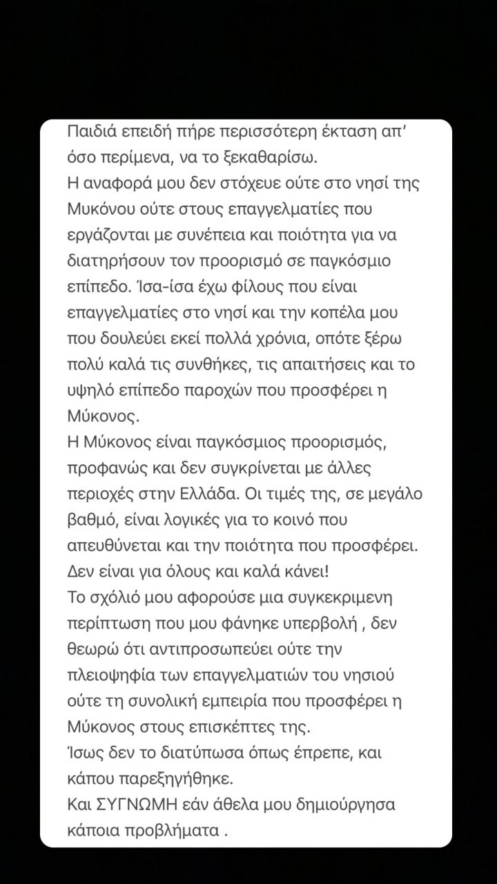 Το σχόλιο μου αφορούσε μια συγκεκριμένη περίπτωση που μου φάνηκε υπερβολή, δεν θεωρώ ότι αντιπροσωπεύει ούτε την πλειοψηφία των επαγγελματιών του νησιού, ούτε τη συνολική εμπειρία που προσφέρει η Μύκονος στους επισκέπτες της. Ίσως δεν το διατύπωσα όπως έπρεπε, και κάπου παρεξηγήθηκε. Και συγγνώμη εάν άθελα μου δημιούργησα κάποια προβλήματα».