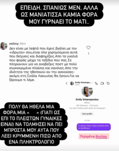 Στη συνέχεια, αφού κοινοποίησε ένα αρνητικό σχόλιο που είχε λάβει από μια ακόλουθό της στο Instagram, η ηθοποιός και επιχειρηματίας ξέσπασε διαδικτυακά απαντώντας: «Επειδή σπανίως μεν, αλλά ως Μανιάτισσα καμιά φορά μου γυρνάει το μάτι… Πολύ θα ήθελα μια φορά, μια (γιατί ως επί το πλείστων γυναίκες είναι) να τολμήσει να πει μπροστά μου αυτά που λέει κρυμμένη πίσω από ένα πληκτρολόγιο. Καρφάκι δεν μου καίγεται, αλλά μιας και σήμερα μιλάμε ανοιχτά, θέλω να πω εκ μέρους πολλών εδώ μέσα πως ΜΠΟΥΧΤΊΣΑΜΕ ΠΙΑ ΜΑΖΙ ΣΑΣ!!!»…