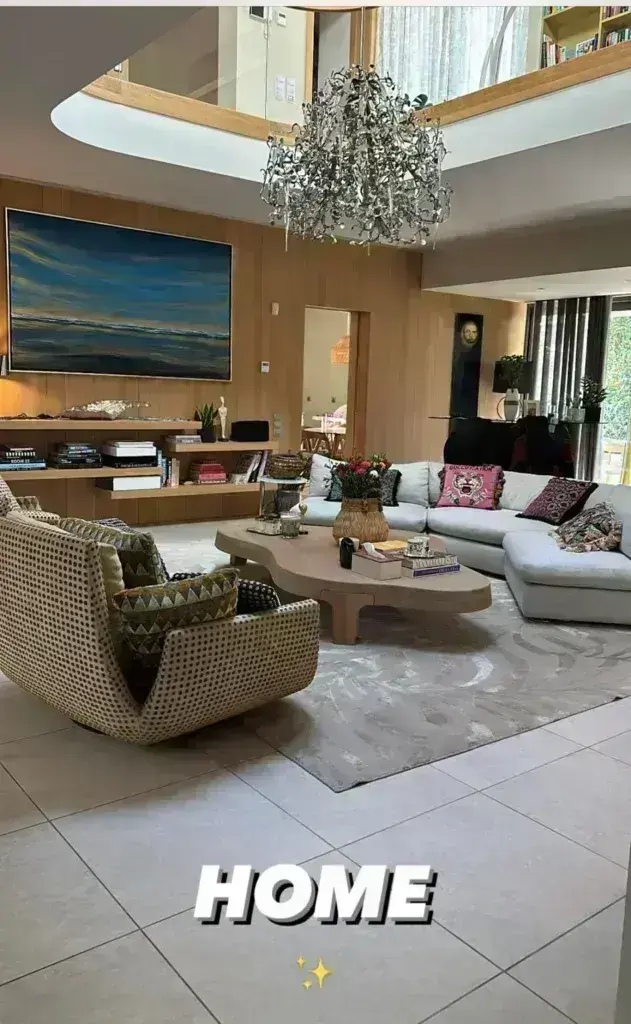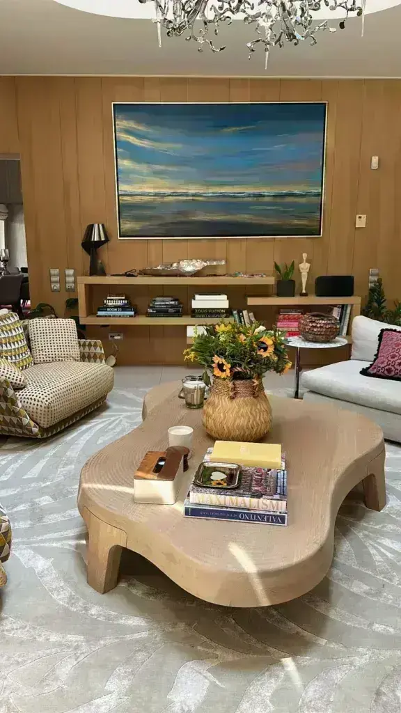 Στο κέντρο του καθιστικού βρίσκεται ένα μεγάλος καναπές με πολυθρόνες και ένα ιδιαίτερο coffee table ενώ ένα επιβλητικό φωτιστικό με έναν μεγάλο πίνακα ολοκληρώνουν τη διακόσμηση.