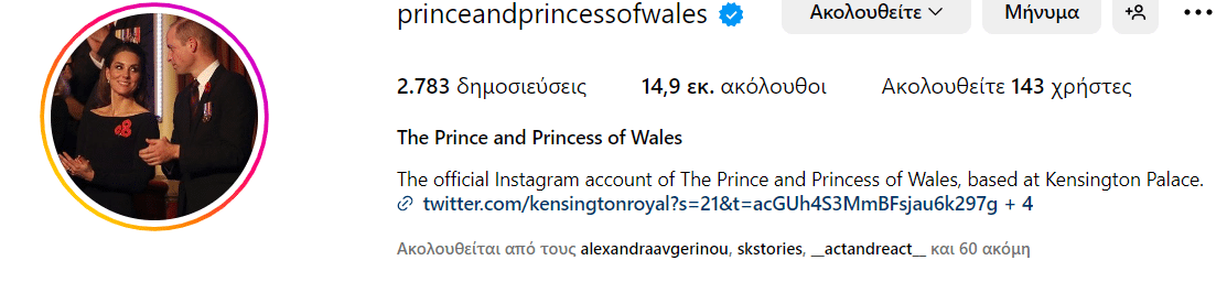 Ο πρίγκιπας Ουίλιαμ και η Κέιτ Μίντλετον άλλαξαν τις εικόνες του προφίλ τους για να σηματοδοτήσουν αυτή τη γιορτή. Ενώ η προηγούμενη εικόνα έδειχνε το ζευγάρι να γελάει μαζί στην περιοδεία τους στην Ιρλανδία το 2020, η νέα φωτογραφία δείχνει το ζευγάρι να χειροκροτεί κατά τη διάρκεια της γιορτής μνήμης του 2019.