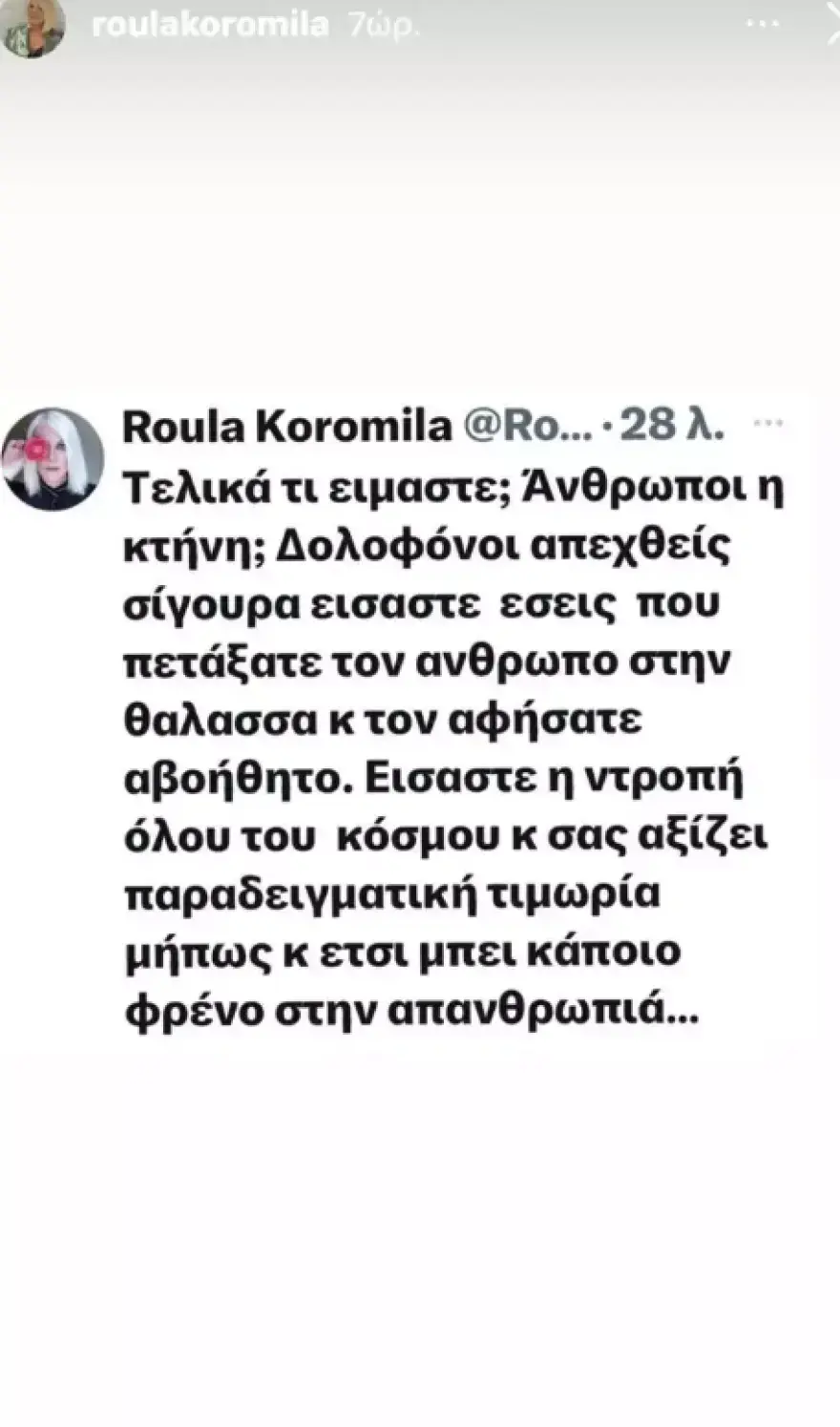 «Τελικά τι είμαστε; Άνθρωποι ή κτήνη; Δολοφόνοι απεχθείς σίγουρα είσαστε εσείς που πετάξατε τον άνθρωπο στην θάλασσα και τον αφήσατε αβοήθητο. Είσαστε η ντροπή όλου το κόσμου και σας αξίζει παραδειγματική τιμωρία μήπως και έτσι μπει κάποιο φρένο στην απανθρωπιά» έγραψε η παρουσιάστρια, απευθυνόμενη σε όσους ευθύνονται για τον θάνατο του άτυχου άνδρα.