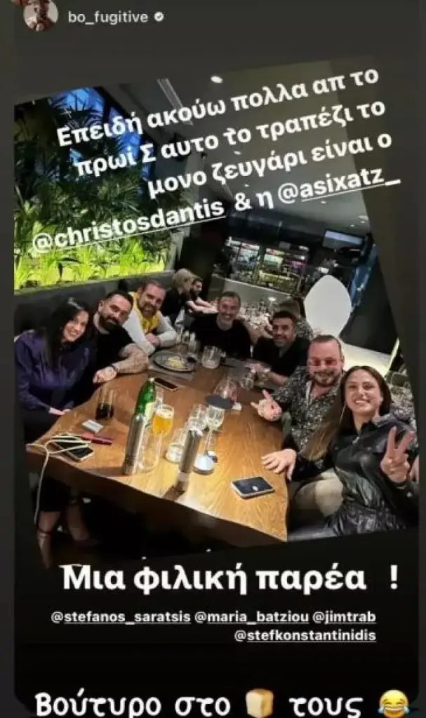 Mέσα από τον προσωπικό του λογαριασμό στο Instagram, με ένα story, διέψευσε τις φήμες που τον θέλουν σε νέα σχέση. Ειδικότερα, ανάρτησε το στιγμιότυπο που προβλήθηκε στην εκπομπή και τον δείχνει να αγκαλιάζει τη μελαχρινή συνοδό του και πάνω σε αυτό έγραψε: «Επειδή ακούω πολλά από το πρωί, σε αυτό το τραπέζι το μόνο ζευγάρι είναι ο Χρήστος Δάντης και η Ασημίνα Χατζηανδρέου. Μια φιλική παρέα», ενώ πρόσθεσε: «Βούτυρο στο ψωμί τους».