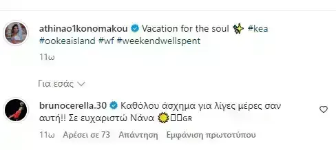 «Διακοπές για την ψυχή» έγραψε η Αθηνά Οικονομάκου, ενώ ο Μπρούνο Τσερέλα σχολίασε κάτω από την ανάρτησή της. «Καθόλου άσχημα για λίγες μέρες σαν αυτή!! Σε ευχαριστώ Νανά», έγραψε ο σύντροφός της για τις διακοπές τους στην Τζια.