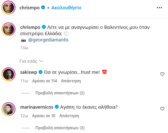 Στη λεζάντα της δημοσίευσής της, η Instagrammer έγραψε: «Λέτε να με αναγνωρίσει ο Βαλεντίνος μου όταν επιστρέψει Ελλάδα;», αναφερόμενη στον σύζυγό της, Σάκη Τανιμανίδη.