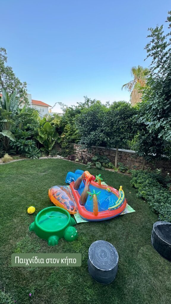 Η Χριστίνα Μπόμπα θέλησε να δείξει και τον κήπο του νέου τους σπιτιού, που είναι αληθινή όαση. Καταπράσινος και μεγάλος, δίνει τη δυνατότητα στην Αριάνα και τη Φιλίππα να ευχαριστιούνται τα παιχνίδια τους.