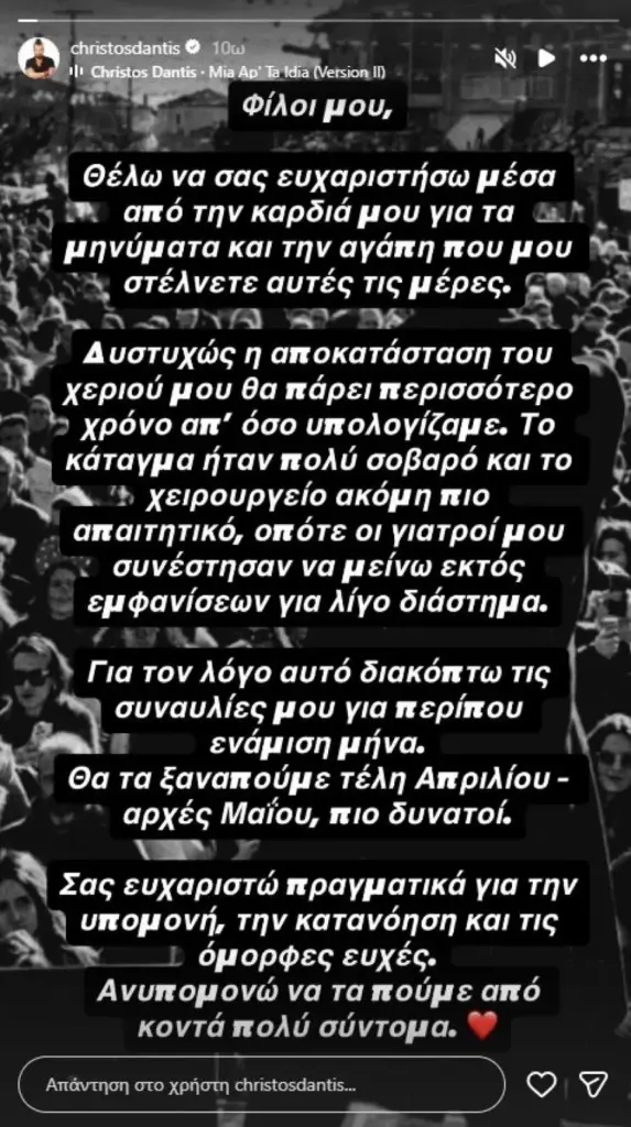 «Φίλοι μου, θέλω να σας ευχαριστήσω μέσα από την καρδιά μου για τα μηνύματα και την αγάπη που μου στέλνετε αυτές τις μέρες. Δυστυχώς η αποκατάσταση του χεριού μου θα πάρει περισσότερο χρόνο από όσο υπολογίζαμε. Το κάταγμα ήταν πολύ σοβαρό και το χειρουργείο ακόμη πιο απαιτητικό, οπότε οι γιατροί μου συνέστησαν να μείνω εκτός εμφανίσεων για λίγο διάστημα», έγραψε στη δημοσίευσή του.