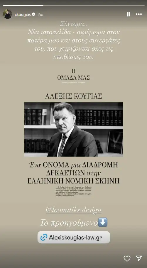 «Σύντομα… Νέα ιστοσελίδα – αφιέρωμα στον πατέρα μου και στους συνεργάτες του, που χειρίζονται όλες τις υποθέσεις του», αναφέρει στην ανάρτησή του ο Χρήστος Κούγιας.