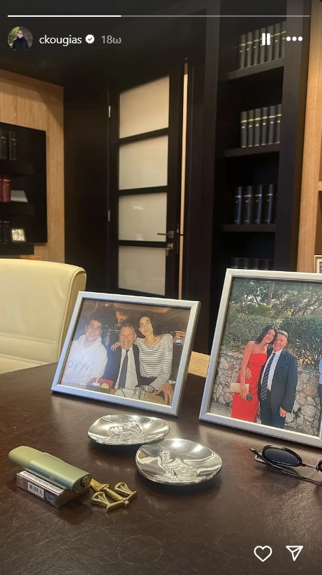 Στη φωτογραφία που ανέβασε με τη μορφή story, ο Χρήστος Κούγιας έδειξε τις κορνίζες που είχε πάνω στο γραφείο του ο Αλέξης Κούγιας, με τον ίδιο και την αδελφή του, Μάιρα.