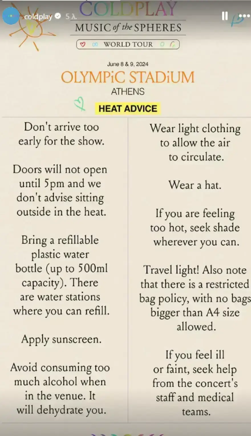 Το συγκρότημα πρότεινε στους θεατές μέσω ανάρτησης στο Instagram να μην περιμένουν στη ζέστη πολύ πριν τις 17:00, οπότε και θα ανοίξουν οι πόρτες του σταδίου. Μεταξύ άλλων, το post προτρέπει το κοινό να φορά αντηλιακό, καπέλο και να αποφύγει την υπερκατανάλωση αλκοόλ.
