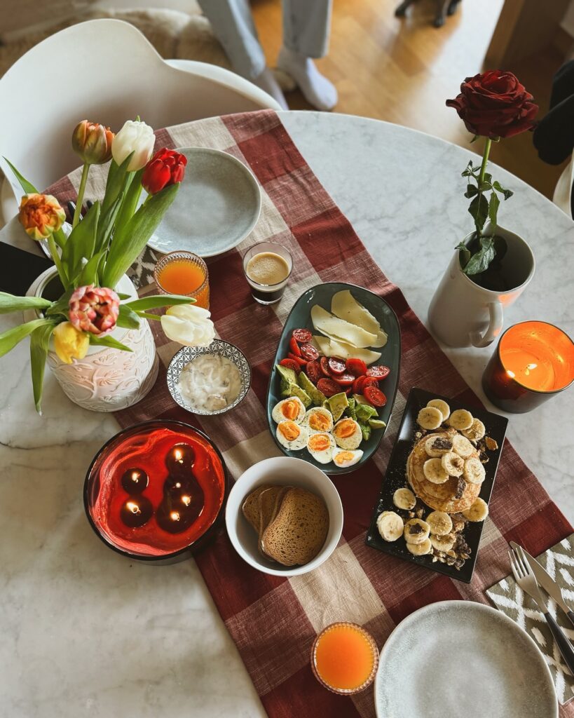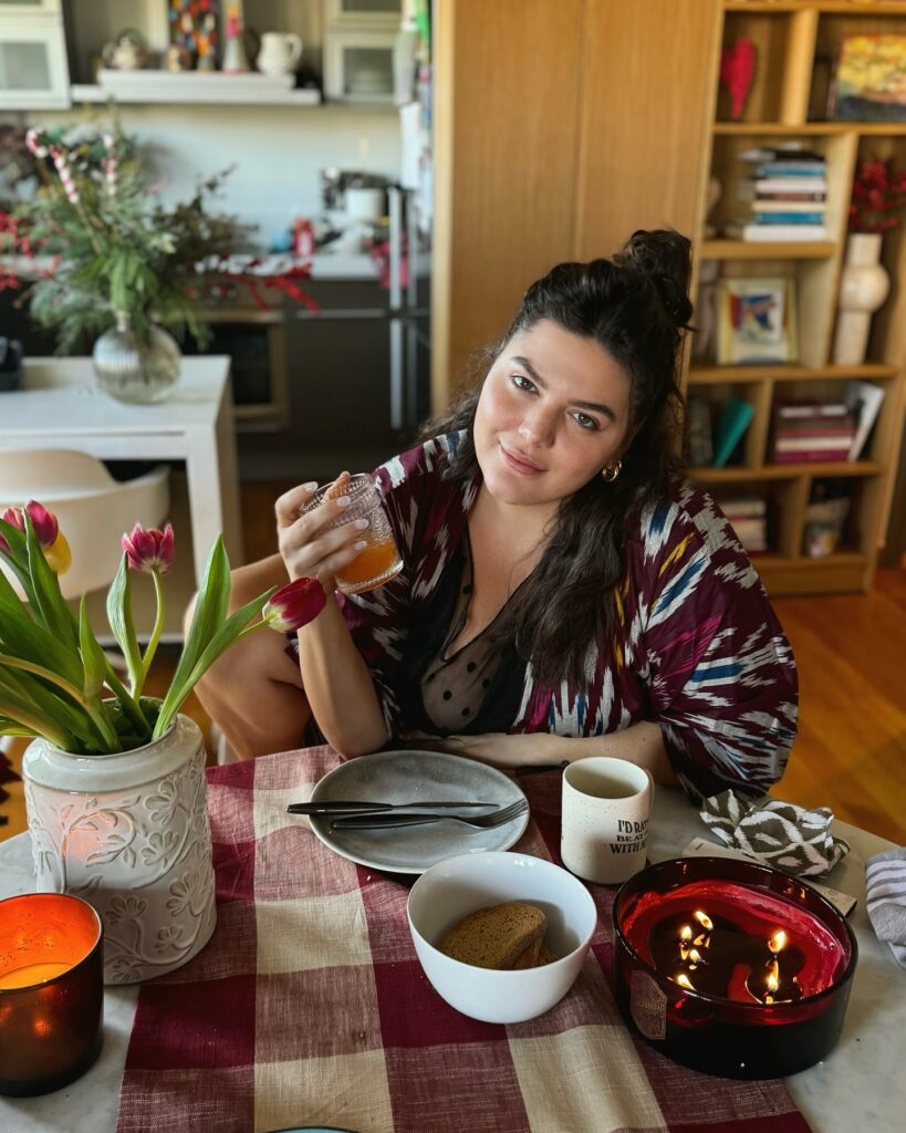 Στις φωτογραφίες που ανήρτησε, την βλέπουμε να τρώει το πρωινό της ενώ πίσω φαίνεται η μοντέρνα κουζίνα της και ένα ξύλινο έπιπλο με βιβλία και διακοσμητικά.