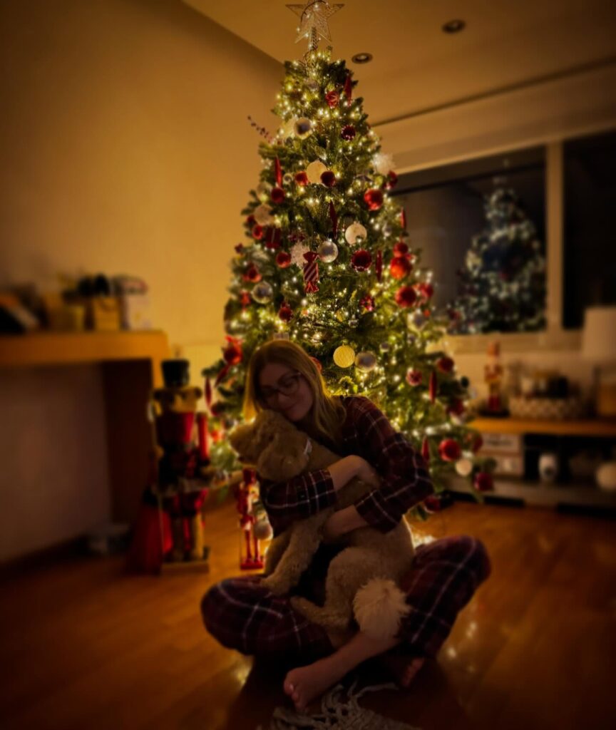Η Δέσποινα Καμπούρη έχει στολίσει ένα εντυπωσιακό δέντρο, το οποίο σε συνδυασμό με τα γκρι χαλιά, το τζάκι και το ξύλινο πάτωμα, συνθέτουν μία ζεστή ατμόσφαιρα.