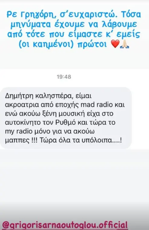 «Θέλω να ευχαριστήσω πάρα πολύ για όλα τα μηνύματα που στείλατε χθες. Τα μηνύματα που είναι εναντίον του Γρηγόρη, δεν θέλω να τα κάνω repost. Αφήστε τους άλλους να βρίζουν, εμείς δεν είμαστε κατά κανενός. Όσοι λέγατε αλαζόνας κτλ, δεν τα υιοθετώ και γι’ αυτό δεν τα έκανα repost», πρόσθεσε.
