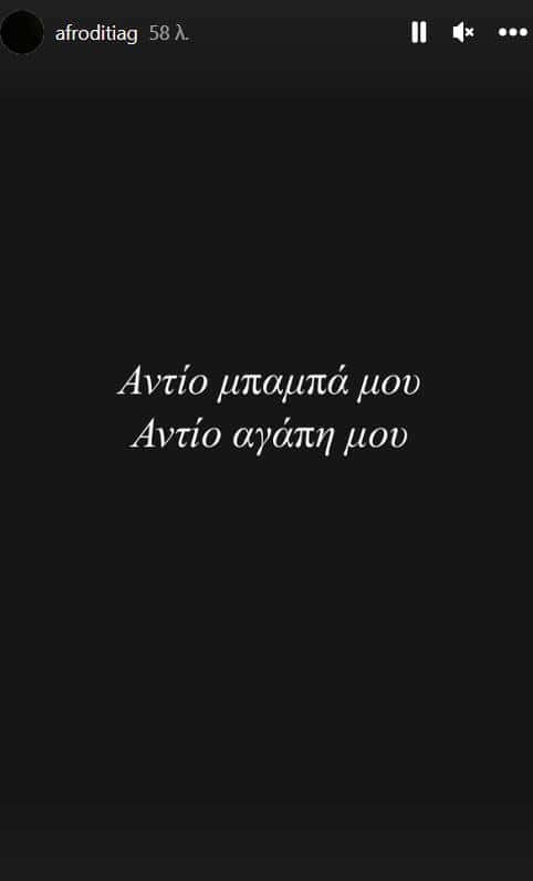 Ο πατέρας της δημοσιογράφου έφυγε από τη ζωή βυθίζοντας σε βαθιά θλίψη την ίδια και ολόκληρη την οικογένειά της. Η είδηση έγινε γνωστή από την ίδια η οποία ανέβασε φωτογραφία σε στόρι στο Instagram γράφοντας με λευκά γράμματα σε μαύρο φόντο «Αντίο μπαμπά μου, αντίο αγάπη μου».