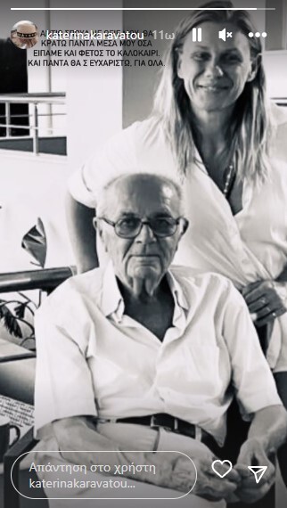 Ειδικότερα, η Κατερίνα Καραβάτου κοινοποίησε μία ασπρόμαυρη φωτογραφία με τον θείο της και έγραψε: «Αντίο σπουδαίε θείε μου. Θα κρατώ πάντα μέσα μου όσα είπαμε και φέτος το καλοκαίρι. Και πάντα θα σε ευχαριστώ. Για όλα».